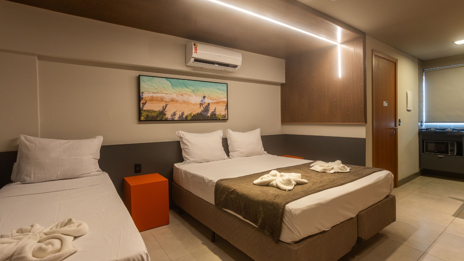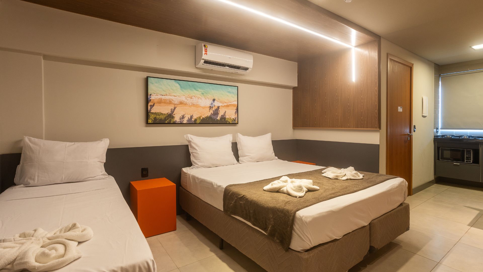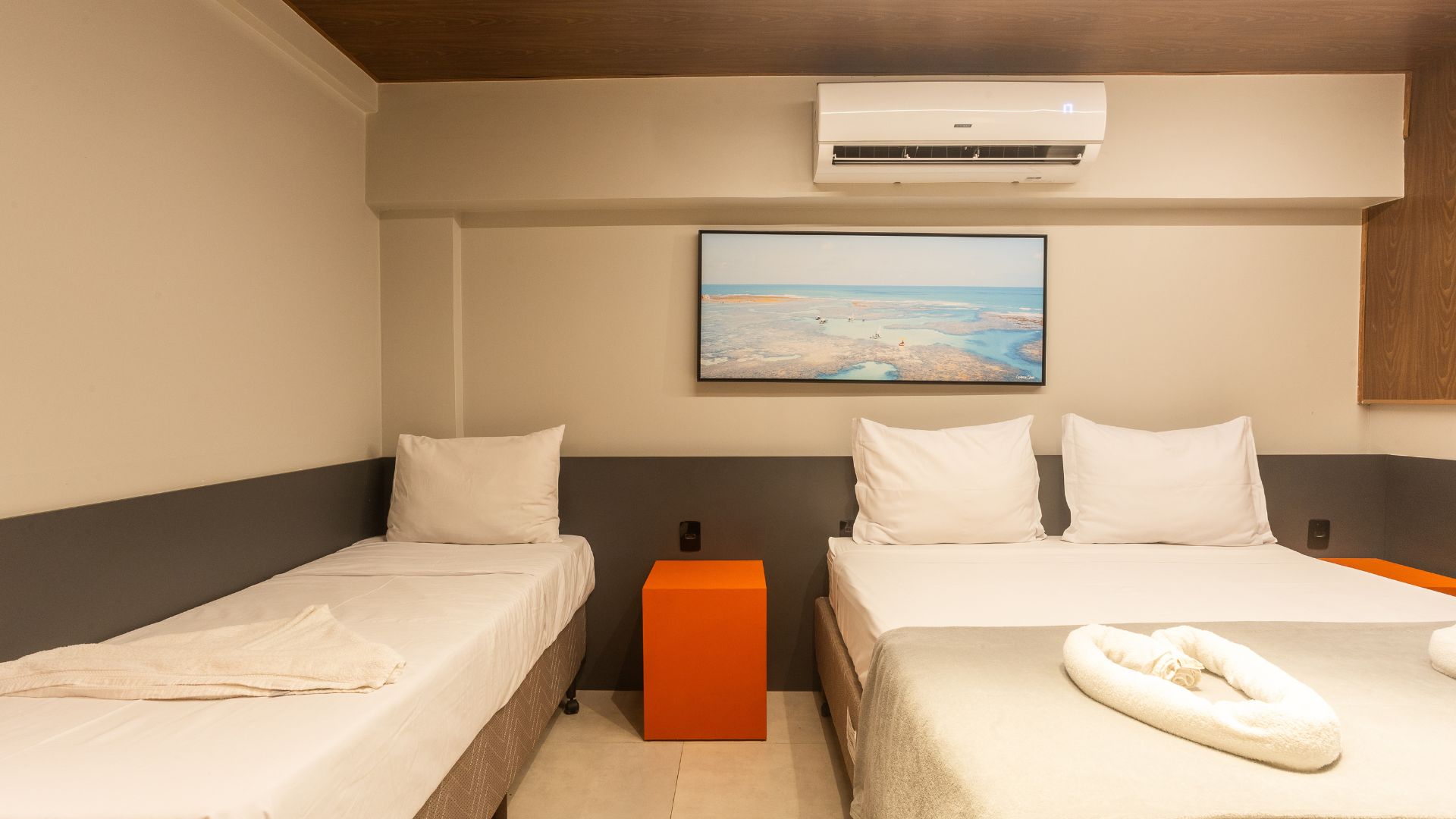 Praticidade com ótimo custo-benefício Cama de casal e solteiro, ambiente funcional, ideal para uma estadia prática, confortável e bem localizada em Porto de Galinhas.
