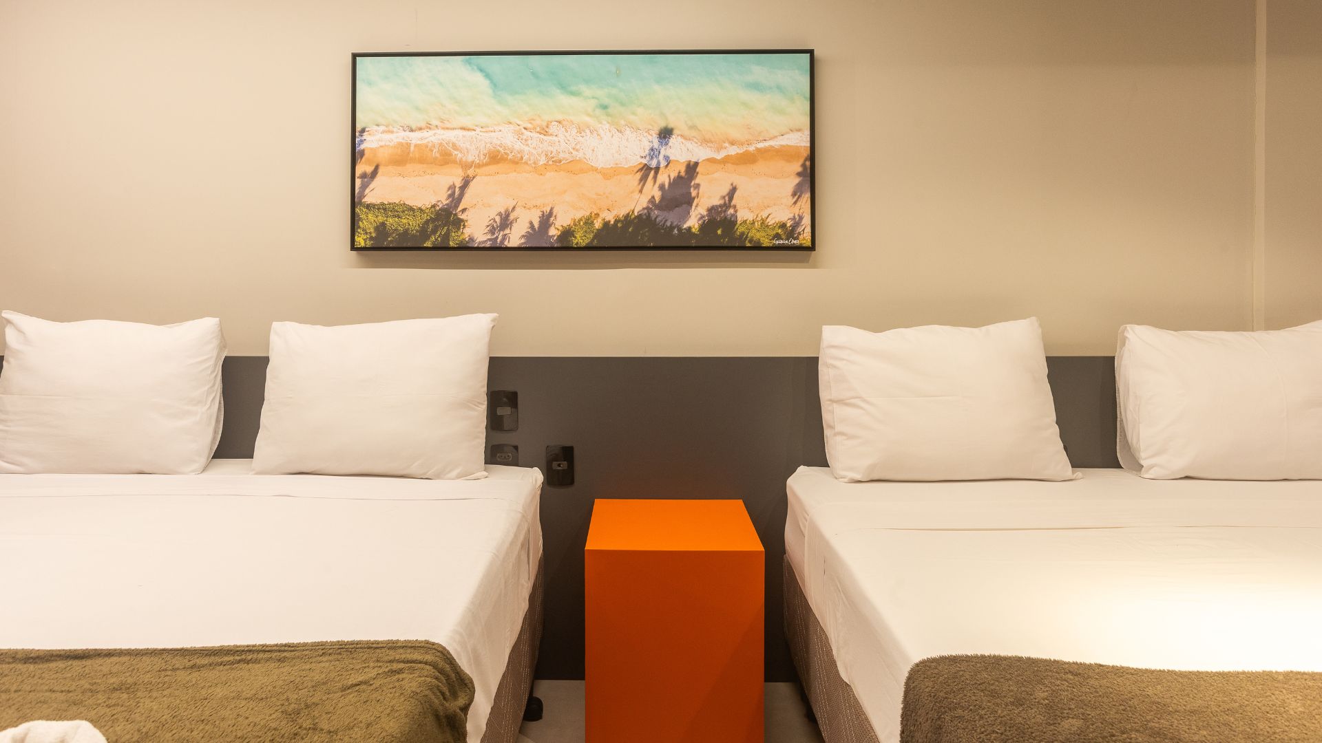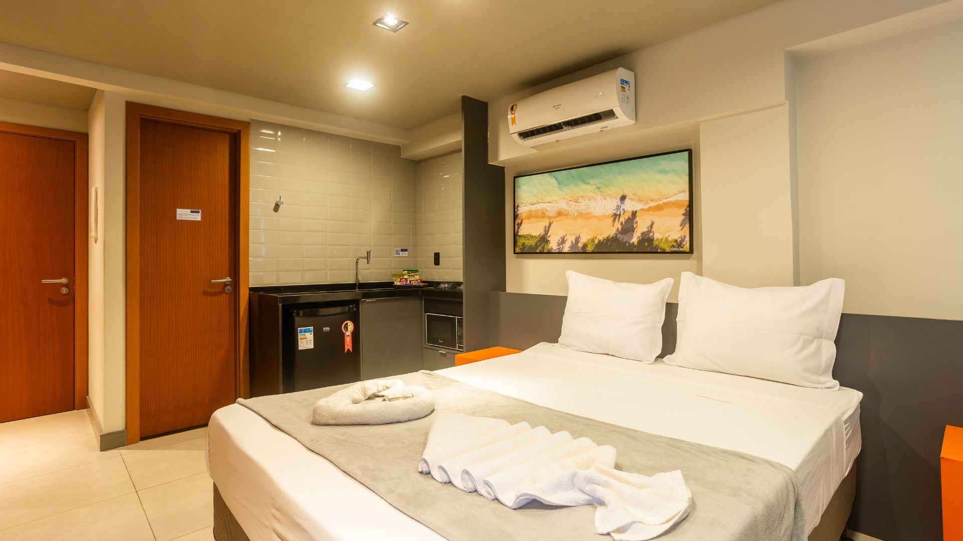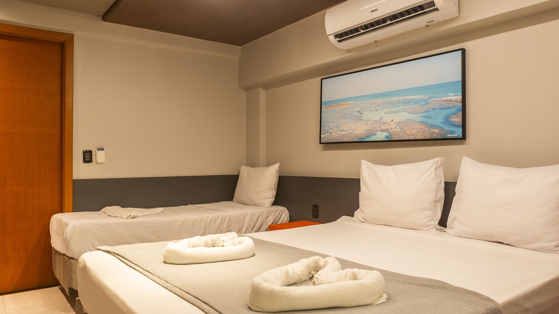 Praticidade com ótimo custo-benefício Cama de casal e solteiro, ambiente funcional, ideal para uma estadia prática, confortável e bem localizada em Porto de Galinhas.