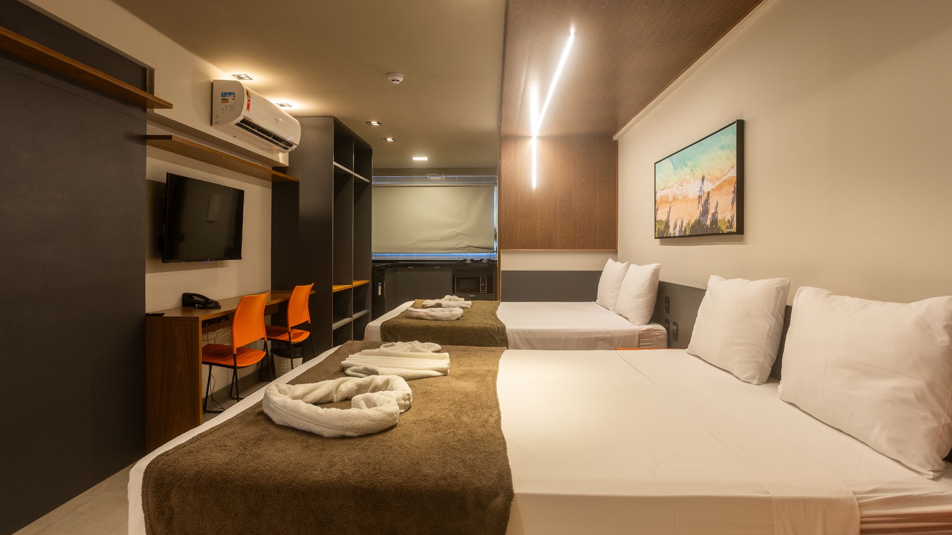 Oferecemos quartos modernos com banheiro privativo, Micro-ondas, frigobar e Wi-Fi gratuito.